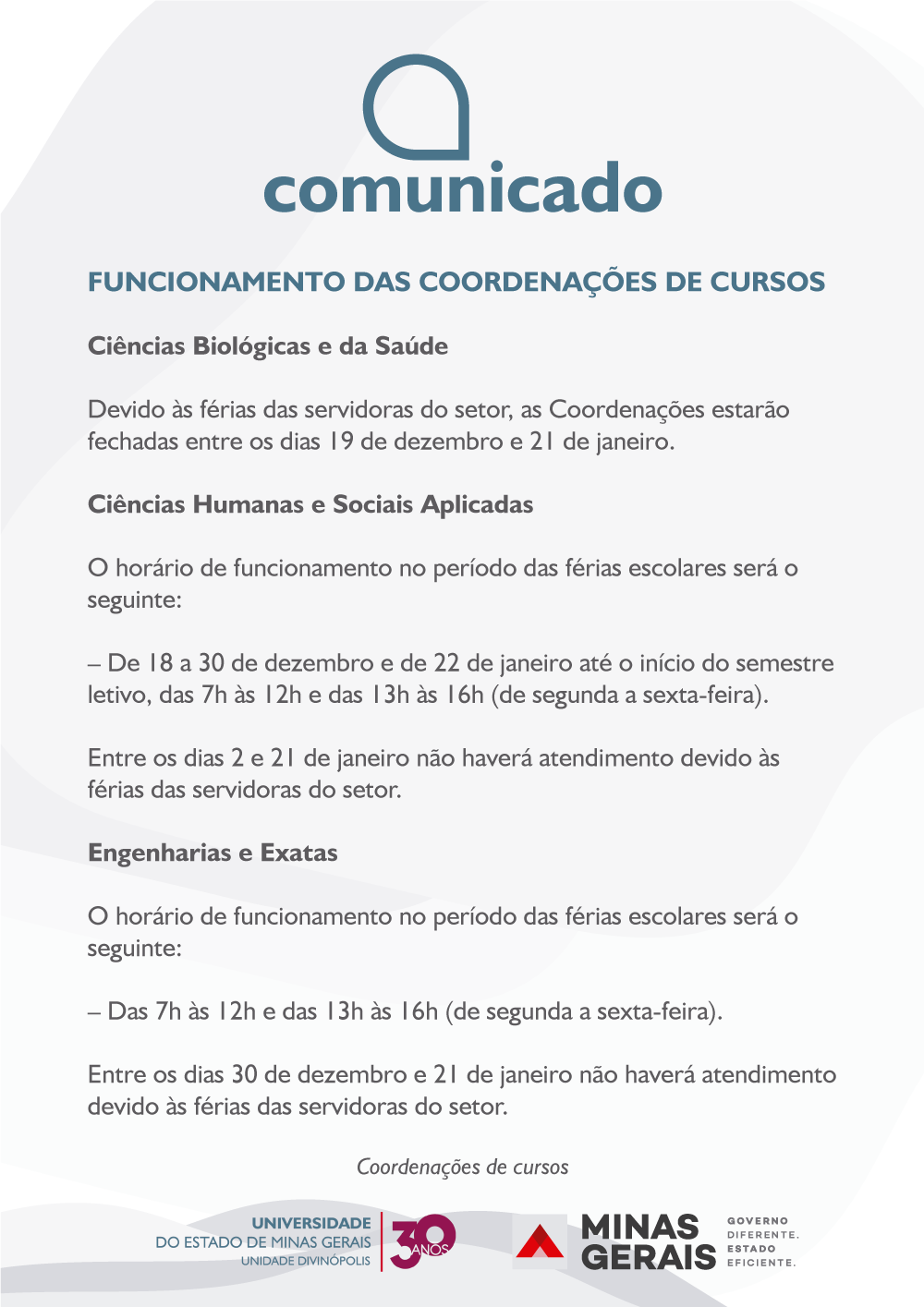 19 Dezembro 2019 Comunicado: Funcionamento das Coordenações de cursos durante as férias escolares Tags: Divinópolis