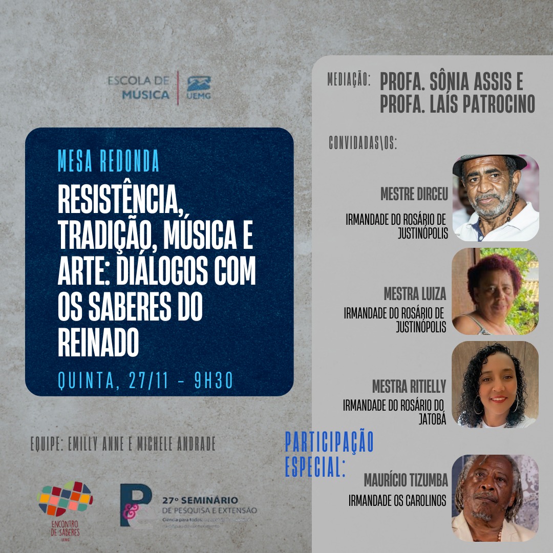 A mesa redonda, intitulada Resistência, tradição, música e arte: diálogos com os saberes do Reinado, contou ainda com a participação especial do multiartista Maurício Tizumba, da Irmandade Os Carolinos. O evento, mediado pelas professoras Sônia Assis e Laís Patrocino, foi marcado pela participação de estudantes e pelo debate sobre a importância do reconhecimento do conhecimento tradicional e sua relação com a promoção da igualdade étnico-racial.