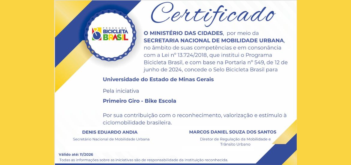 Ao conquistar o Selo “Bicicleta Brasil”, o Primeiro Giro Bike Escola se junta a um seleto grupo de iniciativas brasileiras que impactam positivamente a mobilidade urbana. O prêmio evidencia o compromisso da UEMG Ibirité com ações que unem ensino, pesquisa, extensão e responsabilidade social.