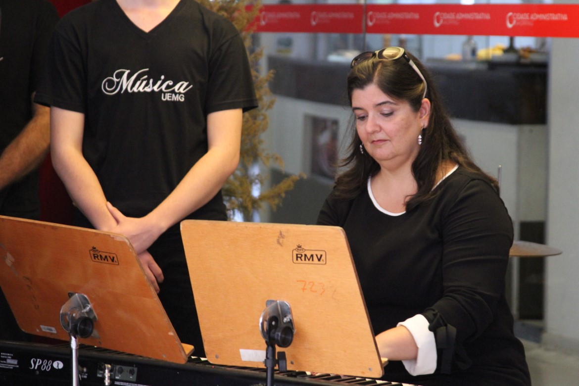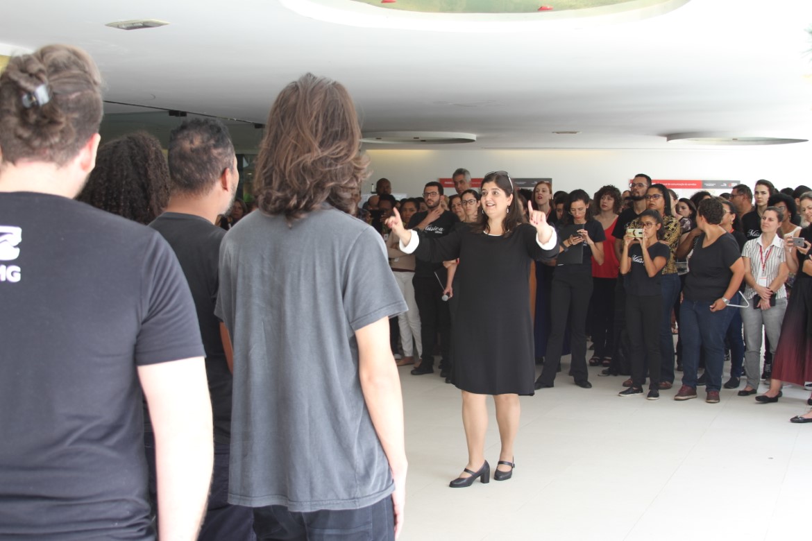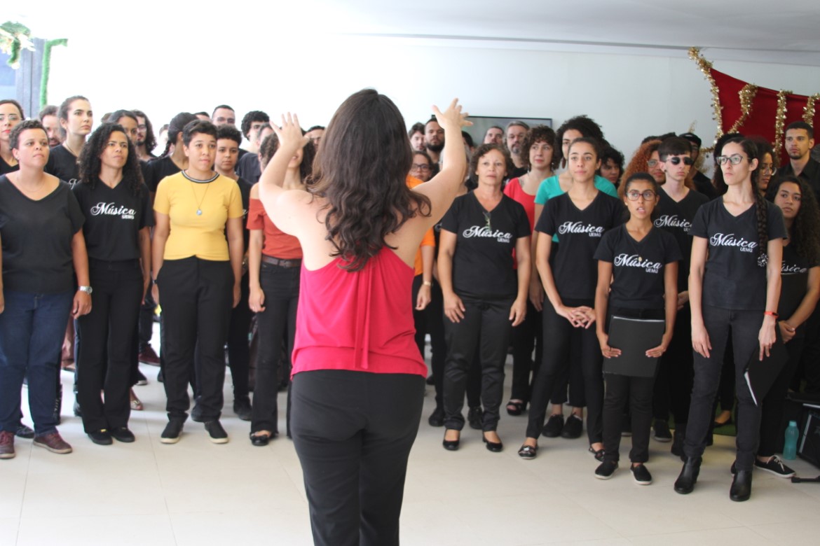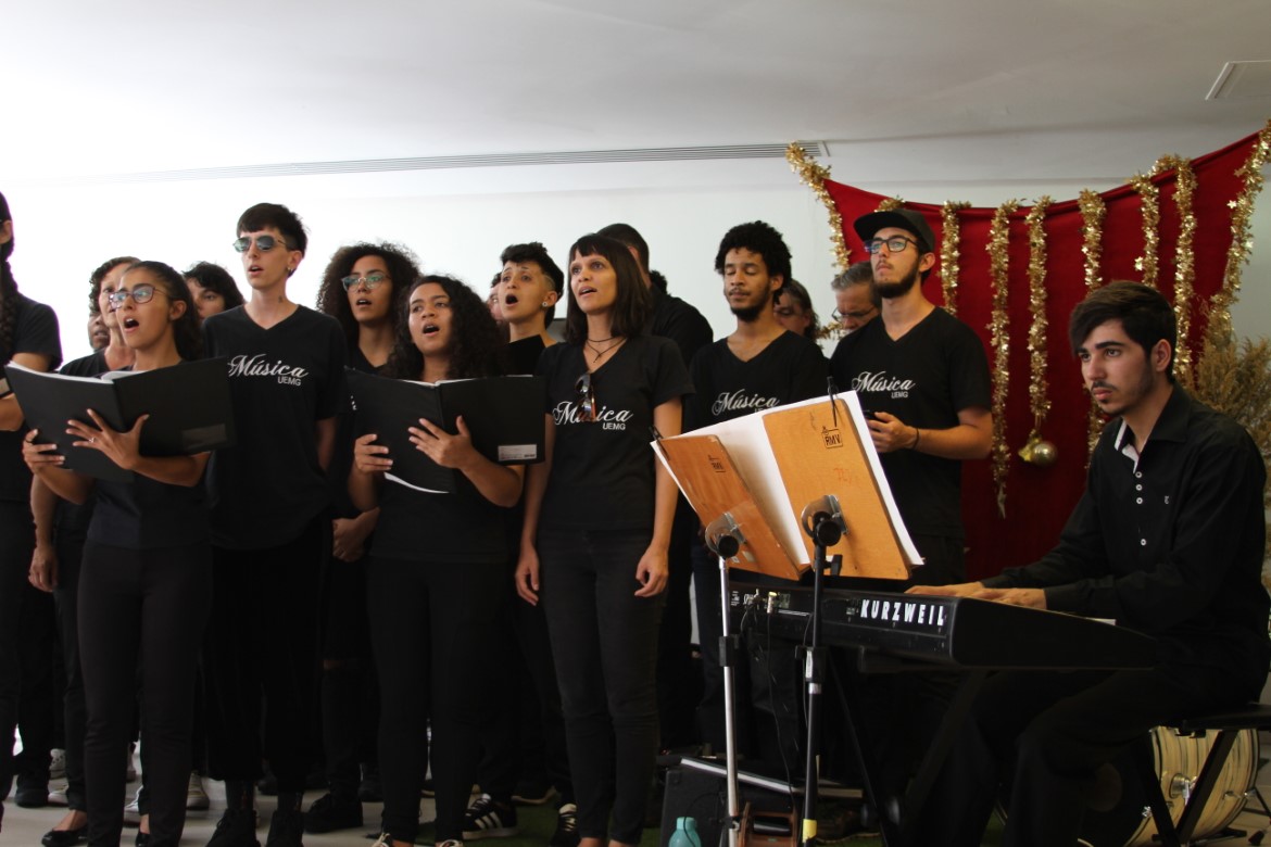 O espaço de convivência da Cidade Administrativa de Minas Gerais, em Belo Horizonte, recebeu hoje (05/12) uma apresentação reunindo os coros feminino e masculino da Escola de Música (EsMu) da UEMG, além do Coro da LEM, formado por estudantes dos períodos iniciais de Licenciatura em Música, também da EsMu.