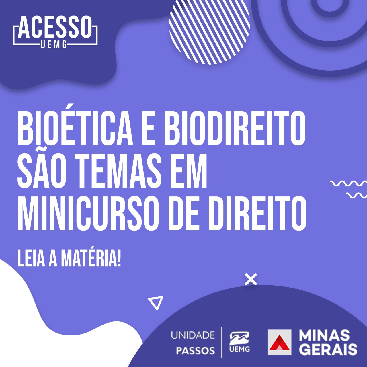 Nesta semana os estudantes do curso de Direito da UEMG Passos estão acompanhando a programação do Minicurso de Bioética e Biodireito. O evento é organizado pelo Centro Acadêmico XII de Fevereiro, o público pode ter acesso à programação de forma gratuita pelo canal do C.A. no Youtube. O Biodireito é uma área do Direito Público e está ligado à Bioética. A programação teve início na última terça-feira, 10, e termina nesta quinta-feira, 12. As palestras não estão sendo disponibilizadas apenas ao vivo, as gravações continuam disponíveis para a comunidade na plataforma digital utilizada para a transmissão.