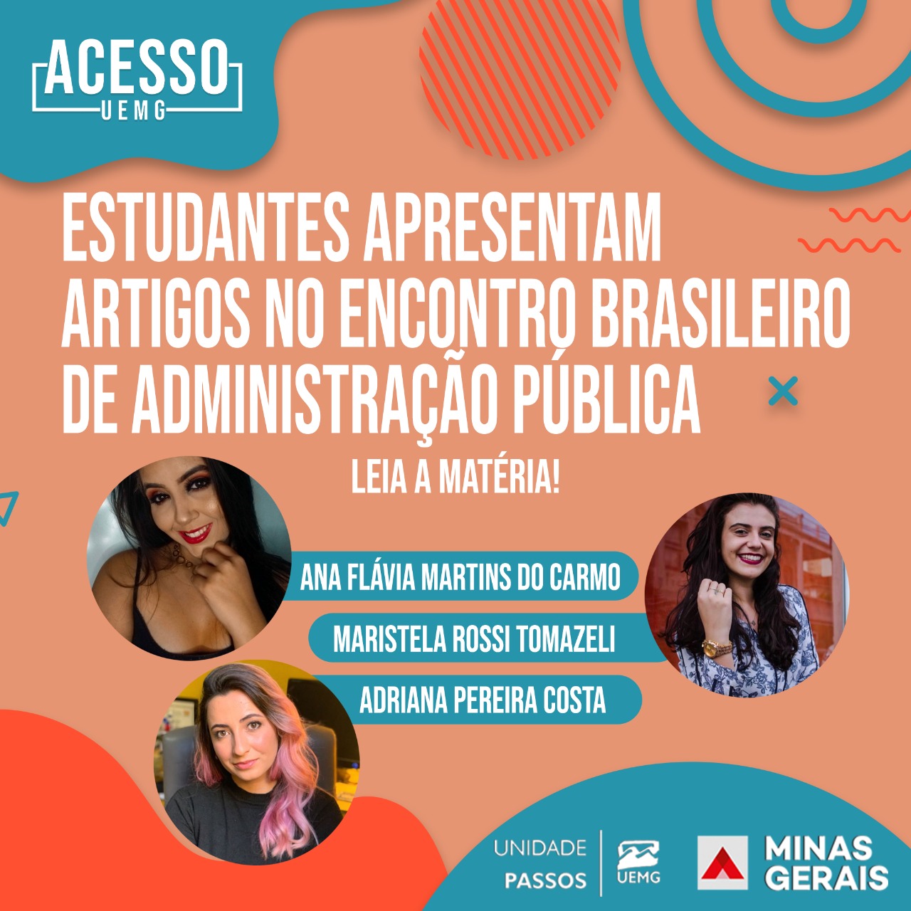 O VIII EBAP - Encontro Brasileiro de Administração Pública teve a participação de dois artigos produzidos por estudantes da UEMG Passos. “Poder Público Municipal: A relação entre decretos municipais e dados de covid-19 na cidade de Passos-MG” e “A elaboração de um índice de segregação socioespacial como ferramenta de gestão pública da cidade de Passos-MG”. O primeiro trabalho tem como objetivo analisar os decretos municipais em relação aos casos positivos e óbitos causados pela COVID-19, o artigo foi desenvolvido pelas estudantes Maristella Rossi Tomazeli, do curso de Direito e Adriana Pereira Costa, de Comunicação Social – Habilitação em Publicidade e Propaganda, com orientação dos docentes Reinaldo Antônio Bastos Filho e Hugo Marques da Silva.