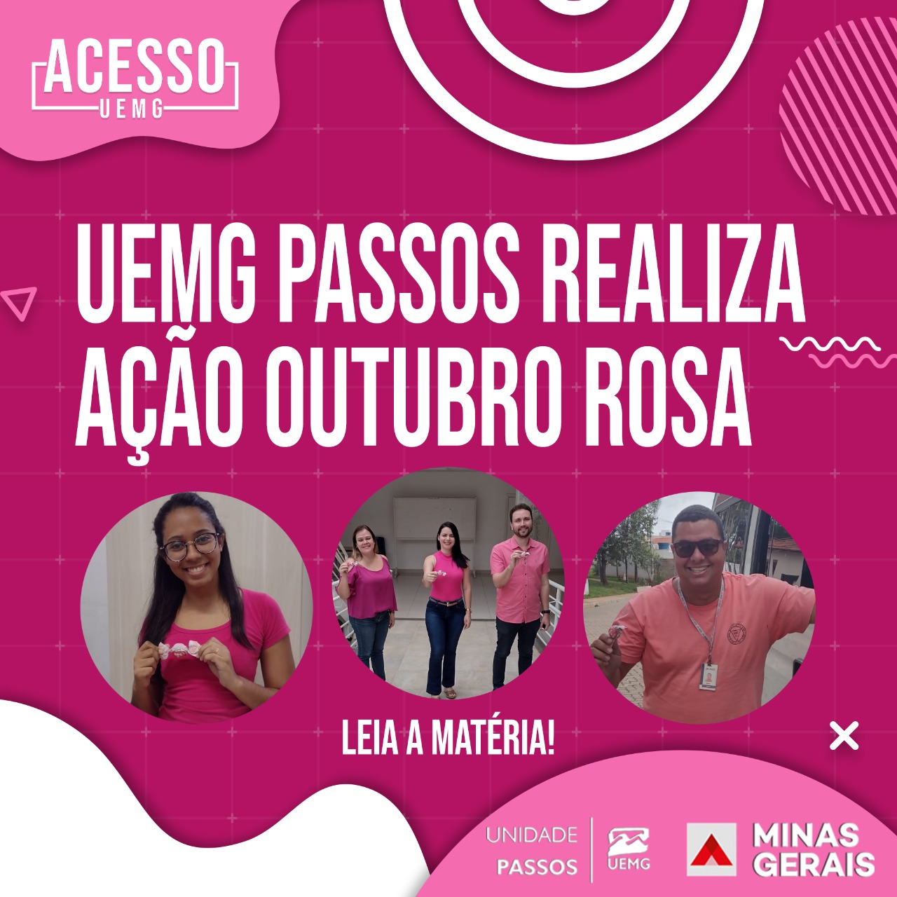 Para encerrar as atividades, às 19h30, pelo Canal Oficial da UEMG Passos no YouTube foi apresentada a Live “Ação Outubro Rosa”. A programação teve a participação do vice-diretor como mediador de um bate-papo entre a coordenadora do Ambulatório Escola, professora Monise Martins da Silva e a convidada especial, Maria Angélica Figueiredo, que é produtora cultural, cientista social e produtora de conteúdo digital.